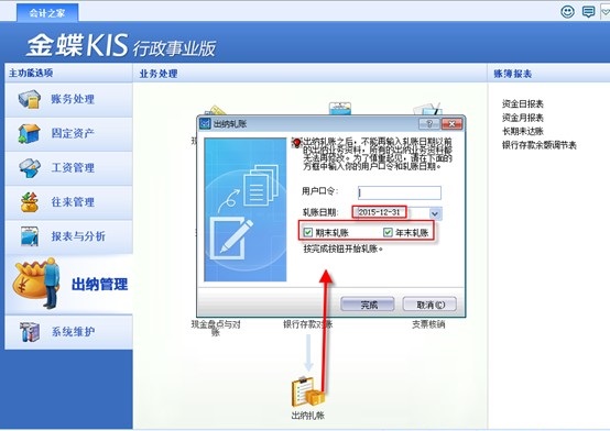 请在年结前将出纳系统的轧账日期调至当前账套中实际年度的最后一天(如2015年12月31日),进行轧账处理。到了年末出纳扎账时,一般会自动勾选选项:年末扎账。