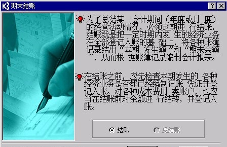 在全部事项处理完毕后,系统开始结账。结账完成之后,系统进入下一个会计期间,并返回到主界面。对于拥有管理员权限的用户, 系统还提供了“反结账”的功能。由于总账系统采用了大型数据库技术,系统一旦启用,所有年度的数据都可以放在一个账套里,所以财务数据的年结功能同月结功能没有区别。