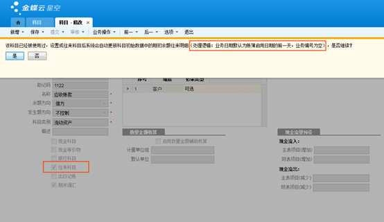 注意:往来科目录入科目初始数据时需要录入期初余额的往来明细,已经使用过的科目设置成往来科目后系统会自动更新期初余额往来明细(处理逻辑:业务日期默认为账簿启用日期的前一天,业务编号为空)。