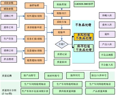 质量管理系统,以物料、物料清单、抽样标准、质量标准、检验方案等为基础信息,以请检单为数据输入源,进行质检验过程的处理及结果记录。