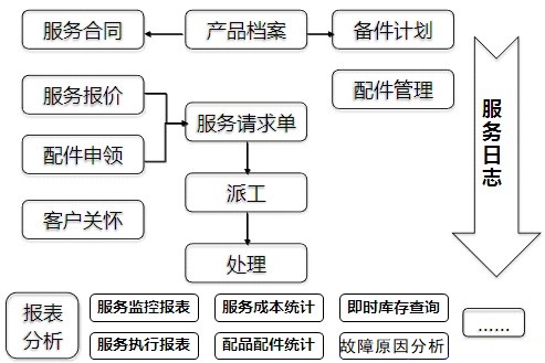 服务管理主要包括产品档案管理、服务合同、服务请求单、派工单、处理单、服务报价、配件管理、配件申领、客户关怀、备件计划、报表分析,系统还提供了客户历史出库清单的查询功能。