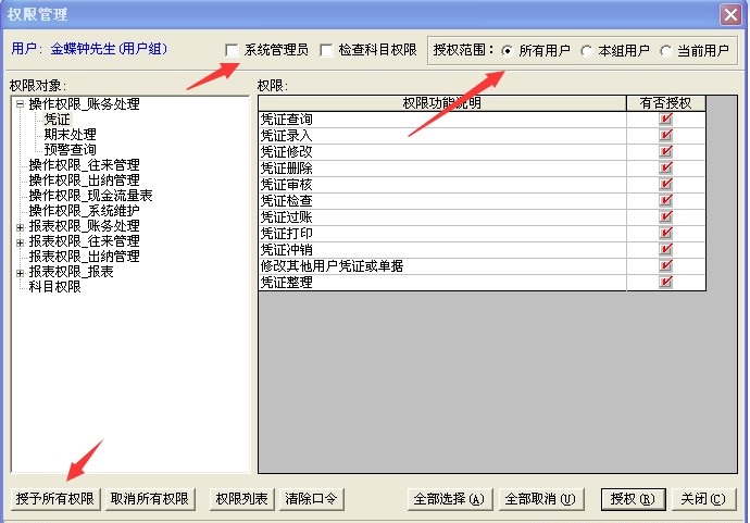 4、打开权限管理窗口,单击选中【授权范围】右边为【所有用户】的单选框。 注意 【所有用户】可以看到所有用户录入的凭证;【本组用户】可以查看同组用户录入的凭证;【当前用户】只能查看到本人录入的凭证。