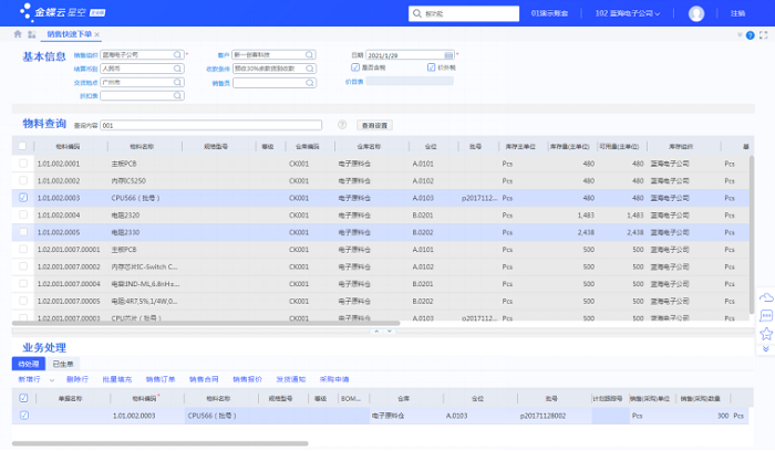 有鉴于此,金蝶云星空最新的功能特性:销售快速下单平台应运而生,用户通过基本信息录入-物料库存查询-一键生单,三步走,即可完成下单流程,大大提升业务员做单效率。