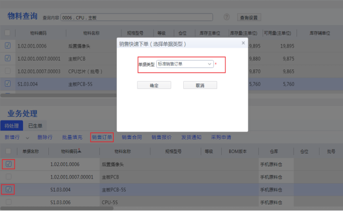根据物料查询结果,将需要进行业务处理的物料添加到“待处理”列表,勾选对应明细,点击对应业务单据按钮,即可自动生成业务单据;生成过程中自动携带价目表、折扣率;自动转换计价单位,避免人为手工操作失误。