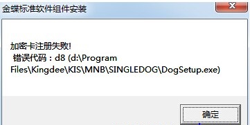 用户安装金蝶KIS标准版时,出现下列提示加密卡注册失败,错误代码:d8: