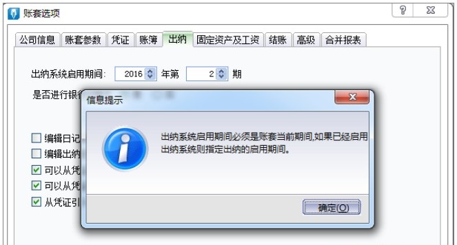 3.【系统维护】→【账套选项】→【出纳】,设置出纳模块系统启用期间为第二期,即可在出纳系统录入现金科目初始余额。