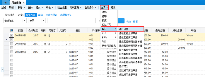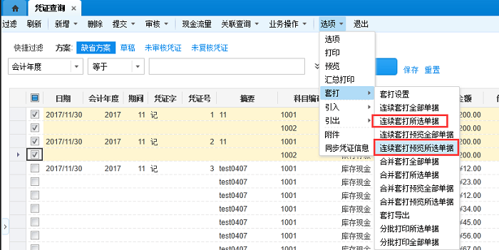 2 勾选需要打印的凭证,在[选项]-[套打]-[连续套打预览所选单据],可以进行预览,[连续套打所选单据],可以进行打印。