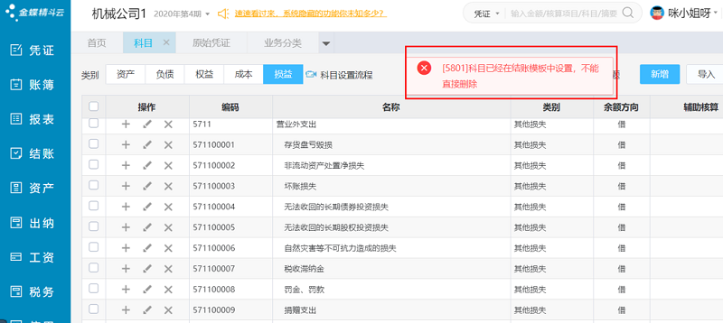 首先,在删除该科目的时候提示:“删除所得税费用科目,提示:[5801]科目已经在结账模板中设置,不能直接删除!”如下图显示: