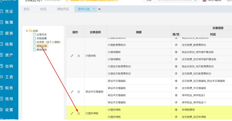 出现这个情况的原因是,原始凭证预设模板占用该科目导致不能删除,那么要删除该科目,进入【凭证】--【原始凭证】--【设置】找到【转账业务】,将预设的模板进行删除,如下图操作: