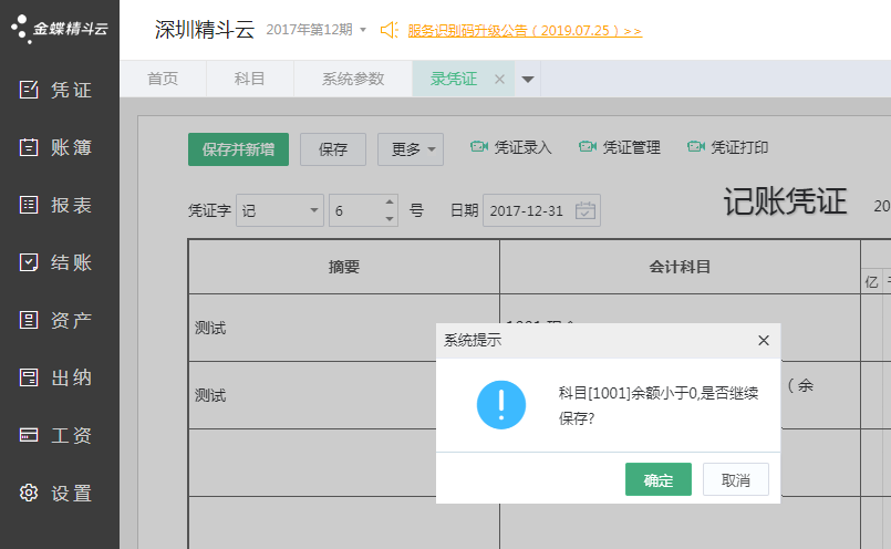 设置后,若录入现金、银行存款科目余额小于0,系统将会提醒。