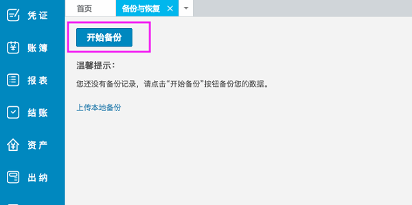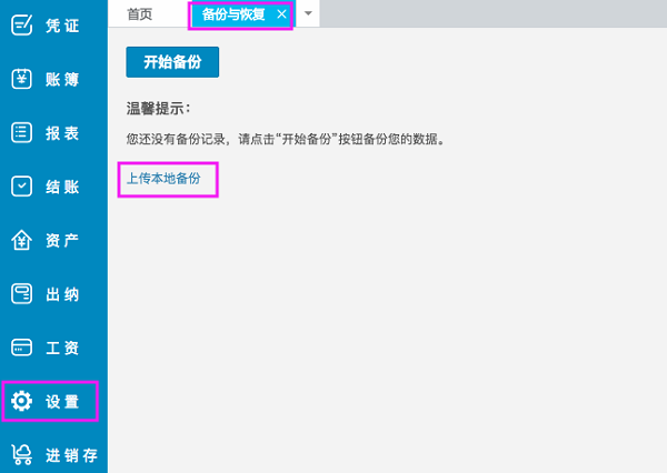 3、进入正式账套,点设置——备份与恢复——上传本地备份,上传成功后点“恢复”。