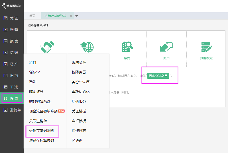同步会计科目是会计系统关联进销存系统后的必要操作,若会计科目有发生变化,请先"同步会计科目",然后再去设置进销存账套的基础资料跟会计账套的科目对应关系。