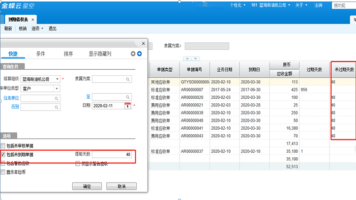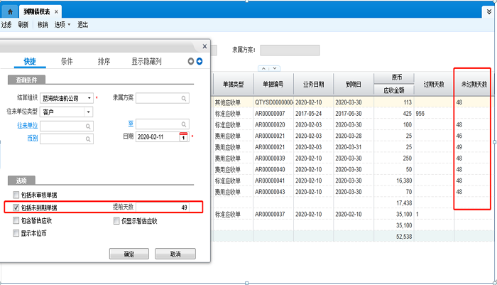 1)【包含未到期单据】与【提前天数】:勾选后,会列式未到期的应收账款,即:到期日-计算日期<=提前天数的单据。如图: