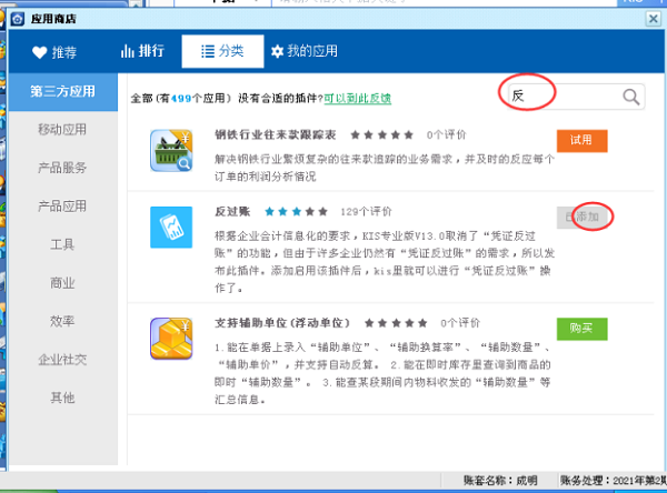 2、私有云或者许可模式,则可以先备份账套,再从软件主界面—【我的KIS】, 在应用服务——添加服务,搜索栏中录入反过账,搜索,添加即可。