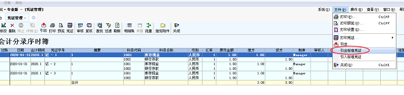 3、引入记账凭证:凭证管理,文件,引出标准凭证,再引入标准凭证。