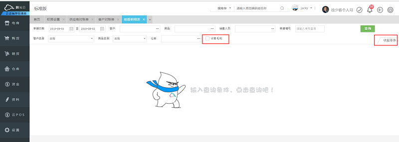 1、销货-销售明细表-更多条件-计算毛利,可计算当前区间销货单销售商品的利润