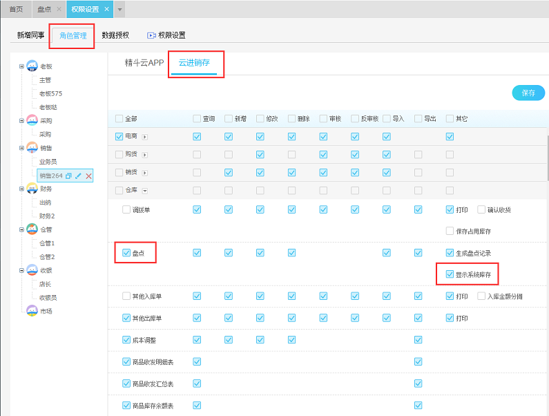 管理员账号进入【设置】-【权限设置】-【角色权限】-【盘点】-勾选【显示系统库存】
