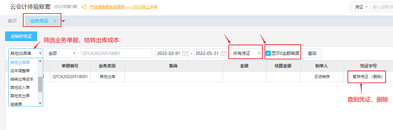 先进入云会计-业务凭证;按以下条件查出凭证并删除。
