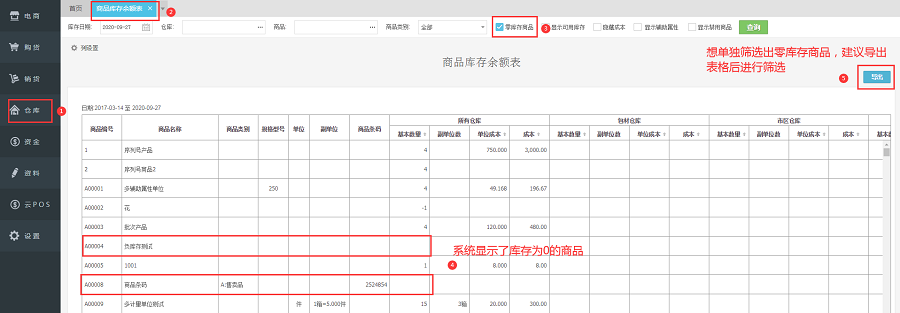 1、【仓库】-【商品库存余额表】-勾选【零库存商品】,点【查询】,系统将显示所有零库存商品