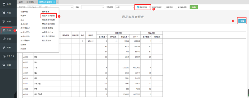 1、【仓库】-【商品库存余额表】-勾选【零库存商品】-【导出】