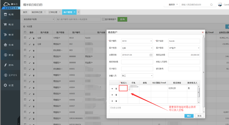 录入客户的联系方式、地址的同时,必须要录入客户联系人才能保存成功。