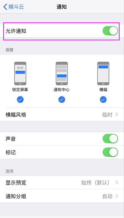 所以只需要在打开精斗云app的时候设置允许后台消息推送,或在IOS系统里面的设置——精斗云——开启允许通知即可。
