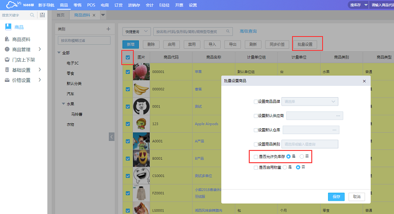 2、商品资料批量设置允许负库存