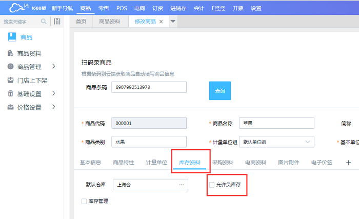 1、商品资料,单个商品设置允许负库存