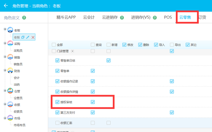 1.门店-授权审核这个功能是控制价格折扣权限的。(在pos开单时,折扣权限不足的时候需要有权限的人来审核控制)