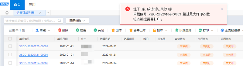 3)设置好后到对应的单据页面打印即可,如打印次数达到上限,或者未审核时打印,页面均会有所提示,如下图效果:
