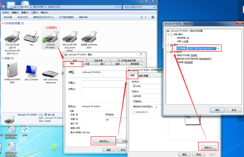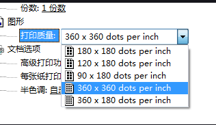 请将打印右键属性——首选项——布局——高级选择中设置打印质量选项:调整为:360*360 dots per inch (选择下拉选择中数值较大的选项)点击确定后再重新打印即可