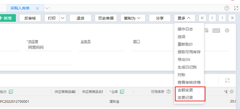 金额变更,可处理在实际业务中,由于市场或者交易条件发生变化,而入库/出库单已经审核了,需要调整单据上的金额的场景,通过此功能,可以更真实反馈实际业务成本。
