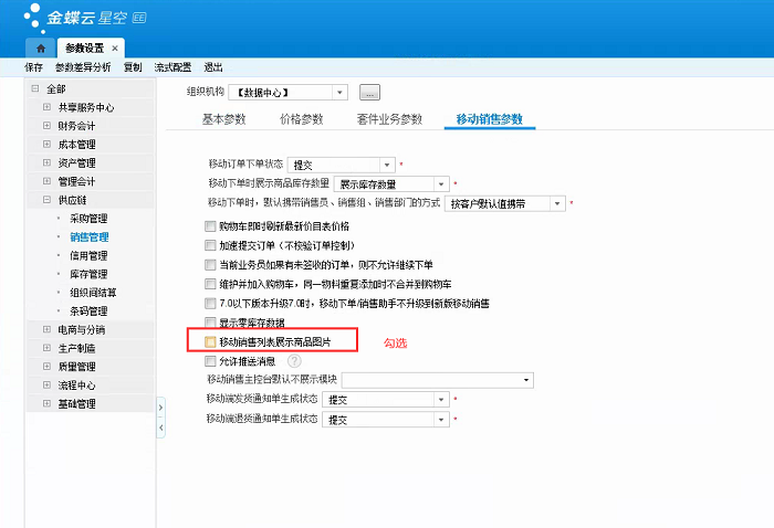 3、点击【销售管理】→【移动销售参数】,勾选【移动销售列表展示商品图片】如下图所示: