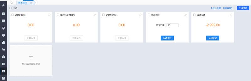 1、单击【账务处理】→【期末结转】,系统预置了结转损益、计提所得税、结转未交增值税、计提附加税、期末调汇(如果有外币业务时)等期末结转业务模板。