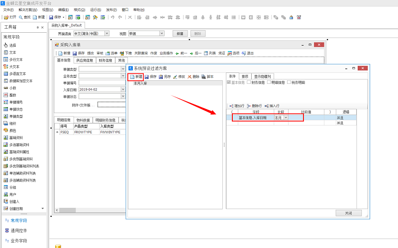 下面以采购入库单为例,设置以单据头业务日期为本月的默认过滤方案