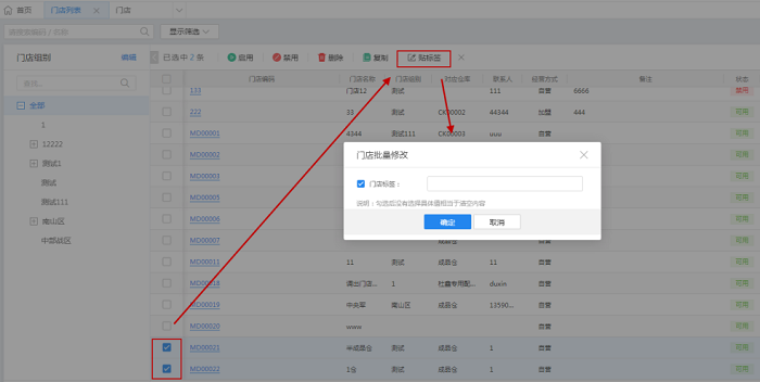门店资料列表页,勾选需要贴标签门店的复选框,支持多选,点击【贴标签】,弹出门店批量修改弹框,勾选门店标签,选择门店标签,支持多选,点击【确实】即可为勾选的门店批量设置标签。