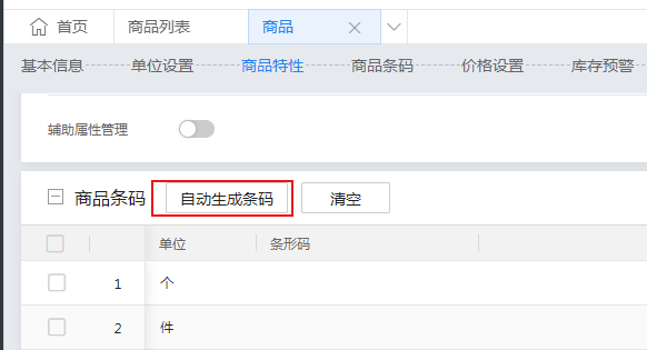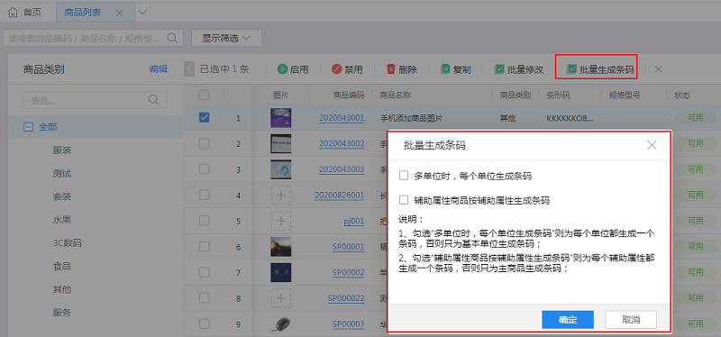 1.批量生成条码:维护了条码生成规则的前提下,在新增商品时可以为不同单位/不同辅助属性批量生成条码;在商品列表选中多个商品也可以批量生成条码。
