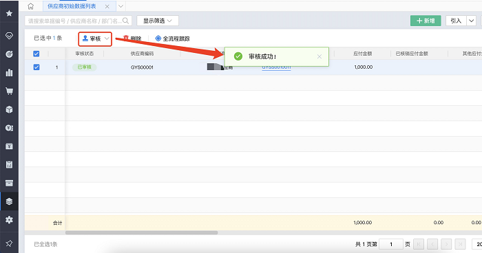 4、供应商初始数据需要审核,在供应商初始数据列表界面,选择录入的初始数据,单击【审核】按钮即可。