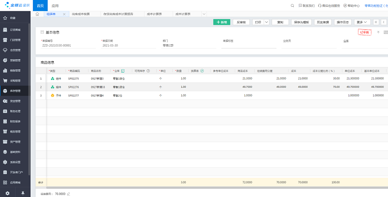 在金蝶云星辰的组装单下录入组装费用后,如果计入到成本?