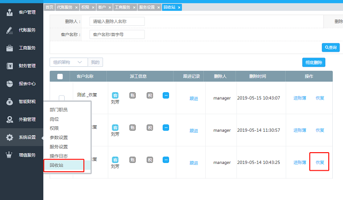 注:从【回收站】中彻底删除的账套不可自行恢复 ,如申请恢复数据,请联系在线客服协助处理;将您的公司名称,要恢复的账套名称,发给客服人员帮确认是否可进行数据的恢复;
