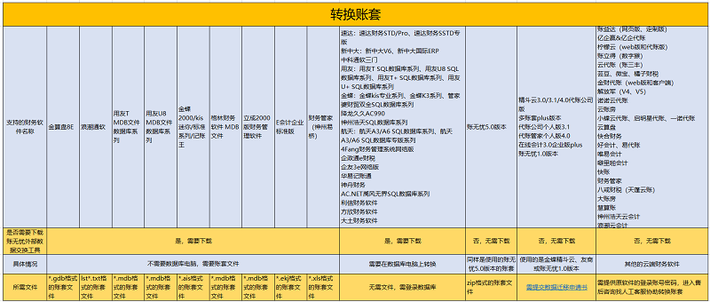 表格中的9种财务软件都是同样的操作步骤,只是不同的软件需要的账套文件格式是不太一样的。