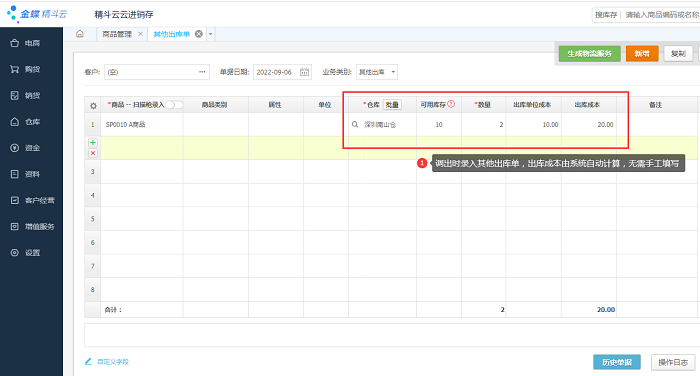 如:A商品从深圳南山仓调出,调入深圳宝安仓,调出商品时则在【仓库】-【其他出库】中录入其他出库单,出库成本由系统自动计算,无需填写,如调出单价为10元。