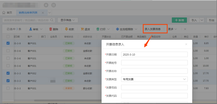 在单据列表中,选择要开票的单据,点击“录入发票信息”,填写开票税号,开票名称,发票号码,发票金额等字段