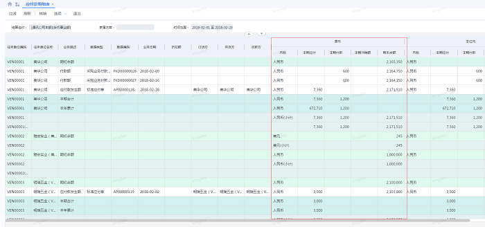 | 勾选仅显示预付 | 0-应付明细表期初余额(原币) | 应付明细表本期付款(原币) | 0-应付明细表本次冲销(原币) | ||