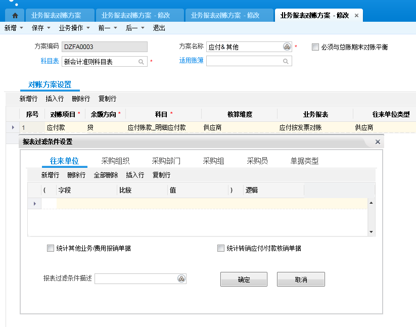 对账方案报表过滤参数设置:“统计转销应付/付款核销单据”,勾选时则本期增加包含转销应付单,本期减少包含应付核销单,不包含应付冲预付的核销单,所以应付和预付要一起对账。