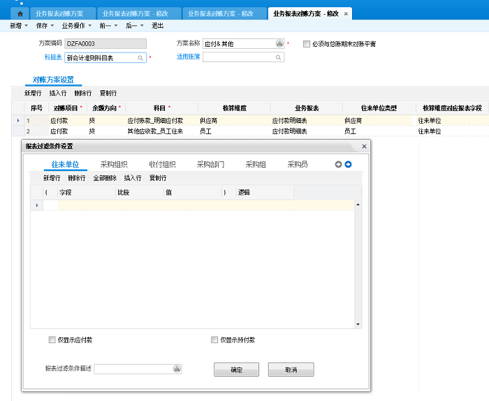 报表过滤条件支持设置往来单位、 采购组织、收付组织、采购部门、采购组、采购员、单据类型等