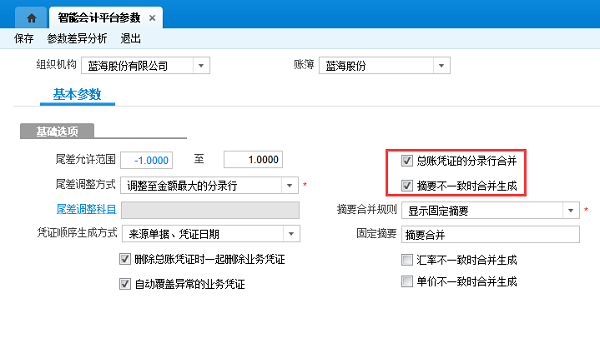 2.进入【智能会计平台参数】,勾选参数“总账凭证的分录行合并”,“摘要不一致时合并生成”;
