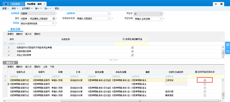 1.依次点击进入【智能会计平台】→【凭证模板】,找到相应单据的凭证模板打开,在模板分录中对于需要合并的分录勾选“业务凭证分录合并”;