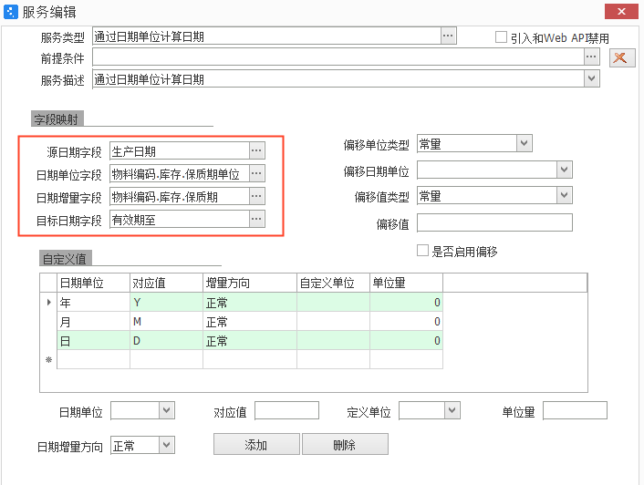 当前系统中根据物料是否启用保质期,在物料编码的值更新配置有"通过日期单位计算日期"的服务,根据生产日期、保质期、保质期单位,计算得到有效期至,生产日期默认赋值为当前日期。