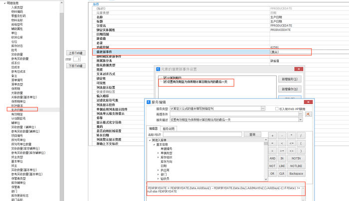 1、生产日期配置值更新,计算赋值有效期值:FEXPIRYDATE = FEXPIRYDATE.Date.AddDays(1 - FEXPIRYDATE.Date.Day).AddMonths(1).AddDays(-1) if FEXPIRYDATE != null else FEXPIRYDATE